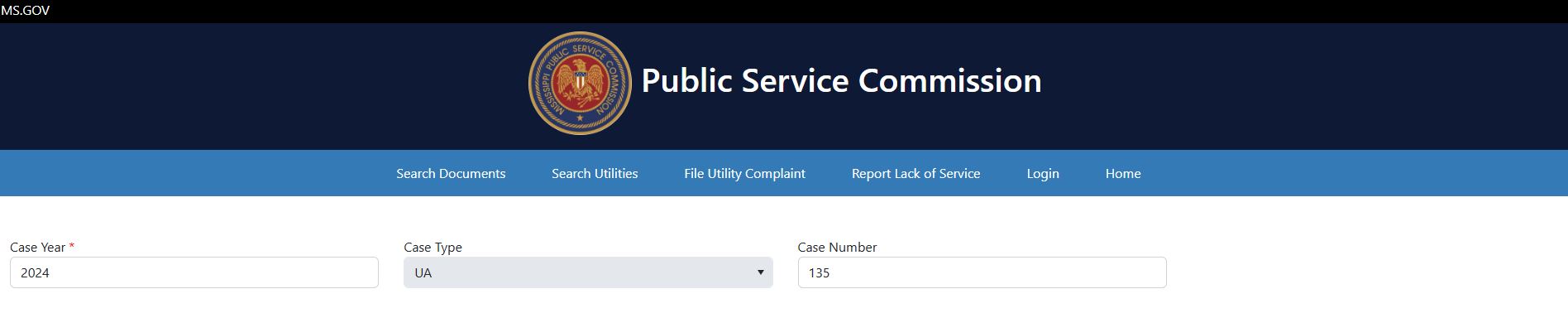 Documents related to the projects CPCN application before the Mississippi Public Service Commission can be accessed on the Mississippi Public Service Commission website here by searching for case number 2024-UA-135 as shown in the image below.